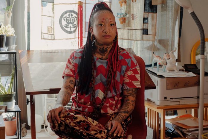 They grew up in a home where East Asian art abounds, so it was easy for Rozen to channel their heritage into their visual works. Their unique style of stick-and-poke, which is heavily inspired by both their African and Filipino roots, in addition to the history of tattooing itself, would eventually grab the attention of Dr. Martens, Squarespace, Inked Magazine, and more — further solidifying their status as an industry professional.